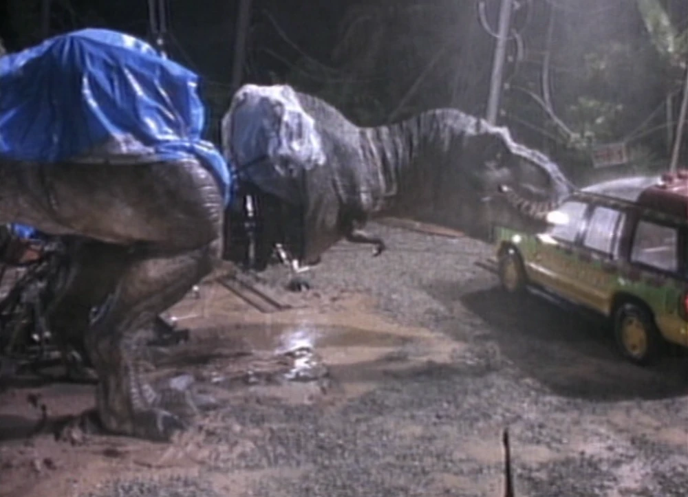 Uno de los grandes atractivos del éxito de Jurassic Park está en el uso de animatrónicos a tamaño real, desarrollados por el equipo de Stan Winston. Estos no eran simples modelos estáticos, sino estructuras complejas con mecanismos hidráulicos que permitían movimientos muy detallados. El caso más famoso es el del Tyrannosaurus rex, una criatura gigantesca que estaba físicamente presente en el rodaje y que interactuaba directamente con los actores.